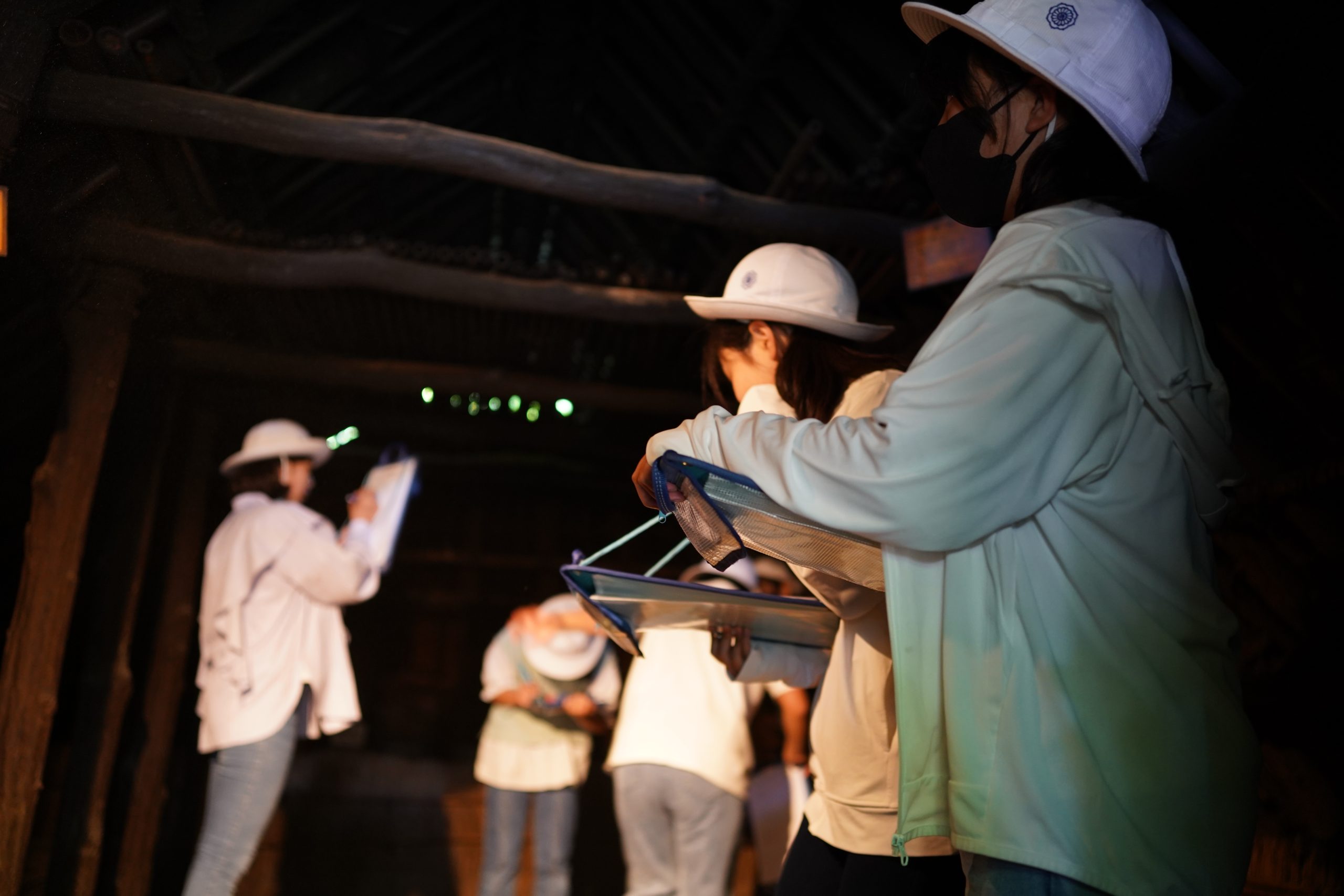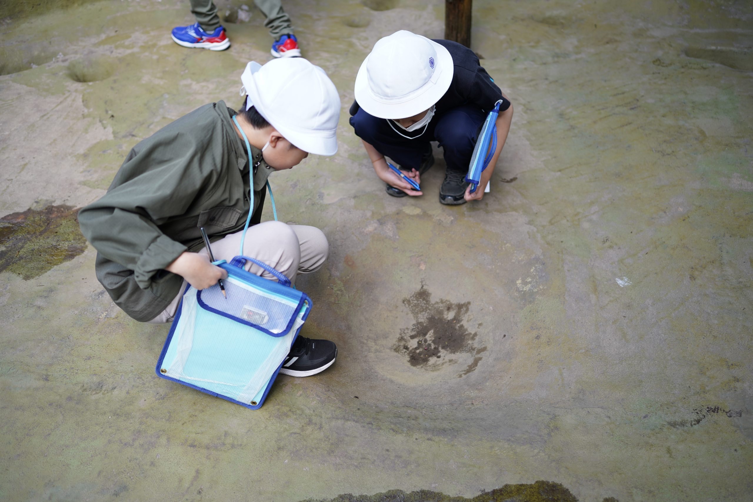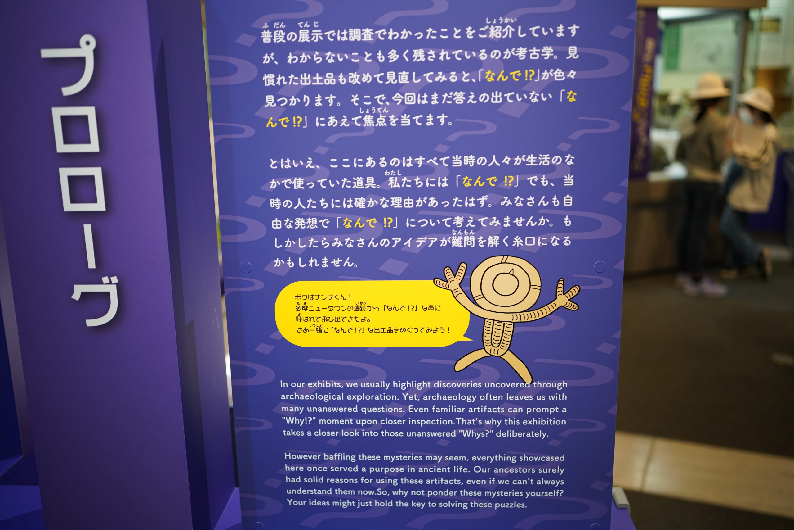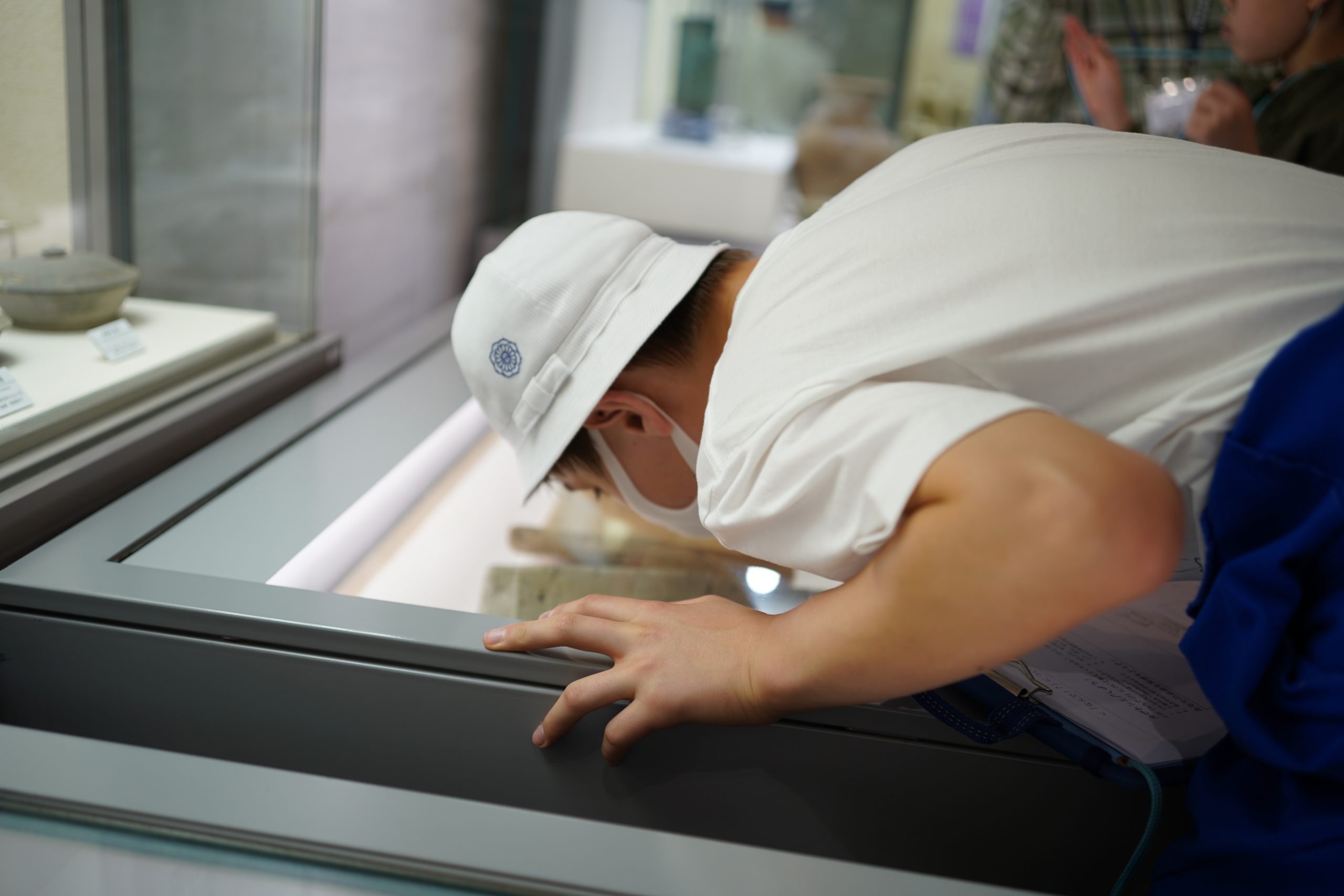 展示ホールでは、実際に出土した土器も触ることができたり、実際にイノシシを採っていた穴と同じ大きさを再現したものにすっぽりと入ってみたりと、興味津々でした。特に今回、企画展として開催されている「多摩のなんで!?な出土品」という展示では、出土されたものの中で、専門家の方でも「なんで?」と思うような形の出土品について、その理由をそれぞれの発想で考え、シェアする企画が行われていました。謎のポーズの人(?)が書かれた土器、何に使うかわからない穴が沢山開いている器、自立しない土器・・・確かに「なんで?」と思うものが沢山ありました。探究のように答えの無い発想のシェアに、子どもたちも楽しみながら縄文時代の出土品に思いを馳せました。
