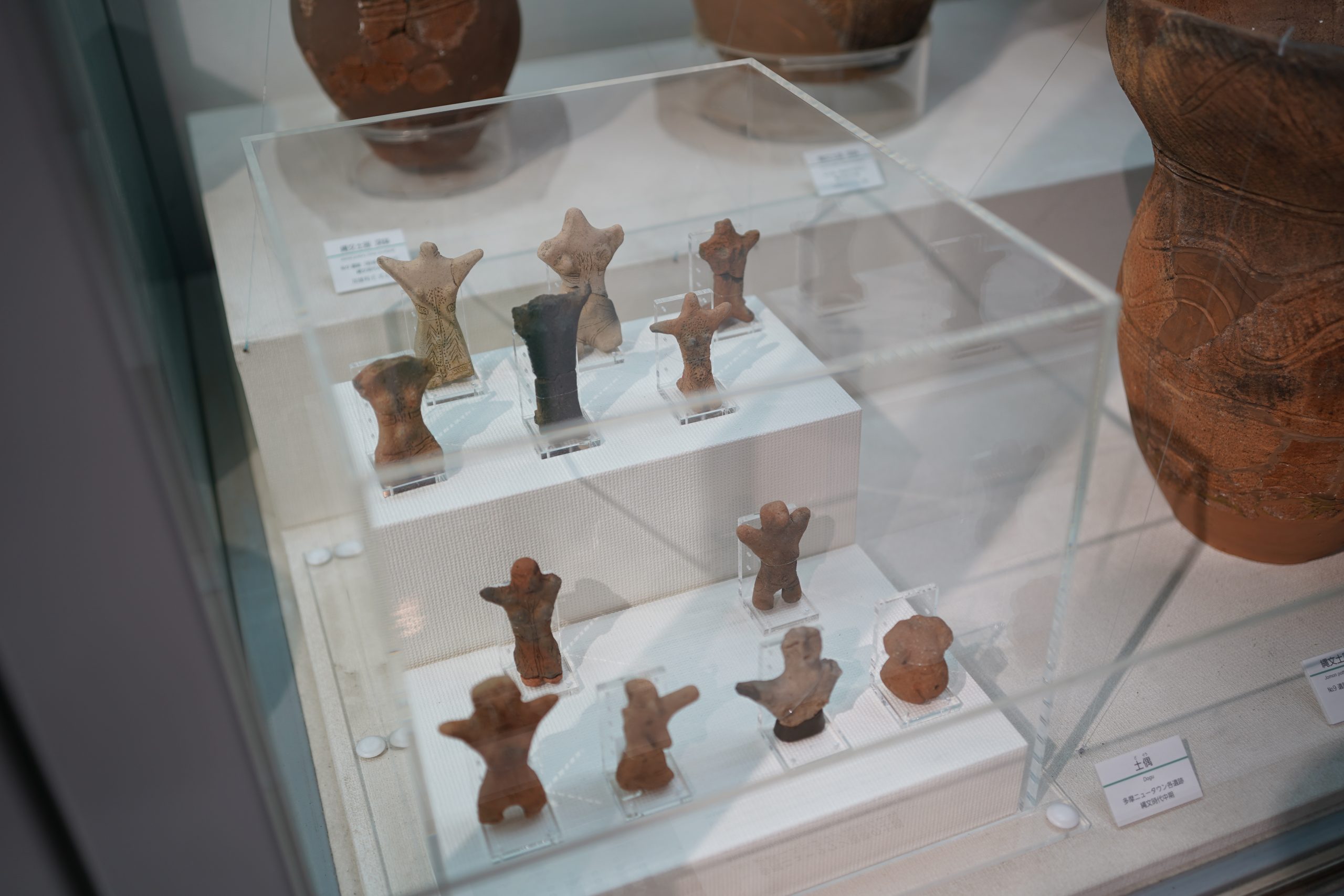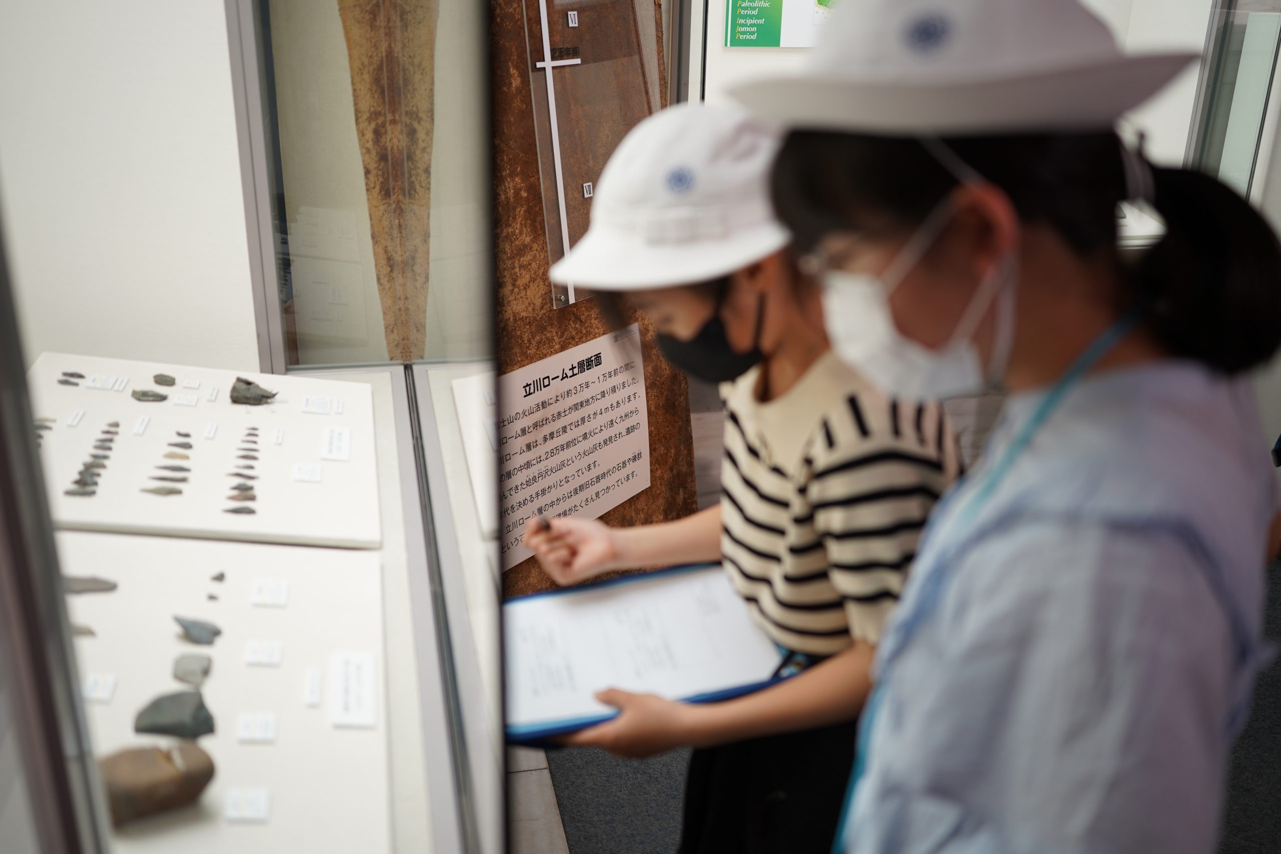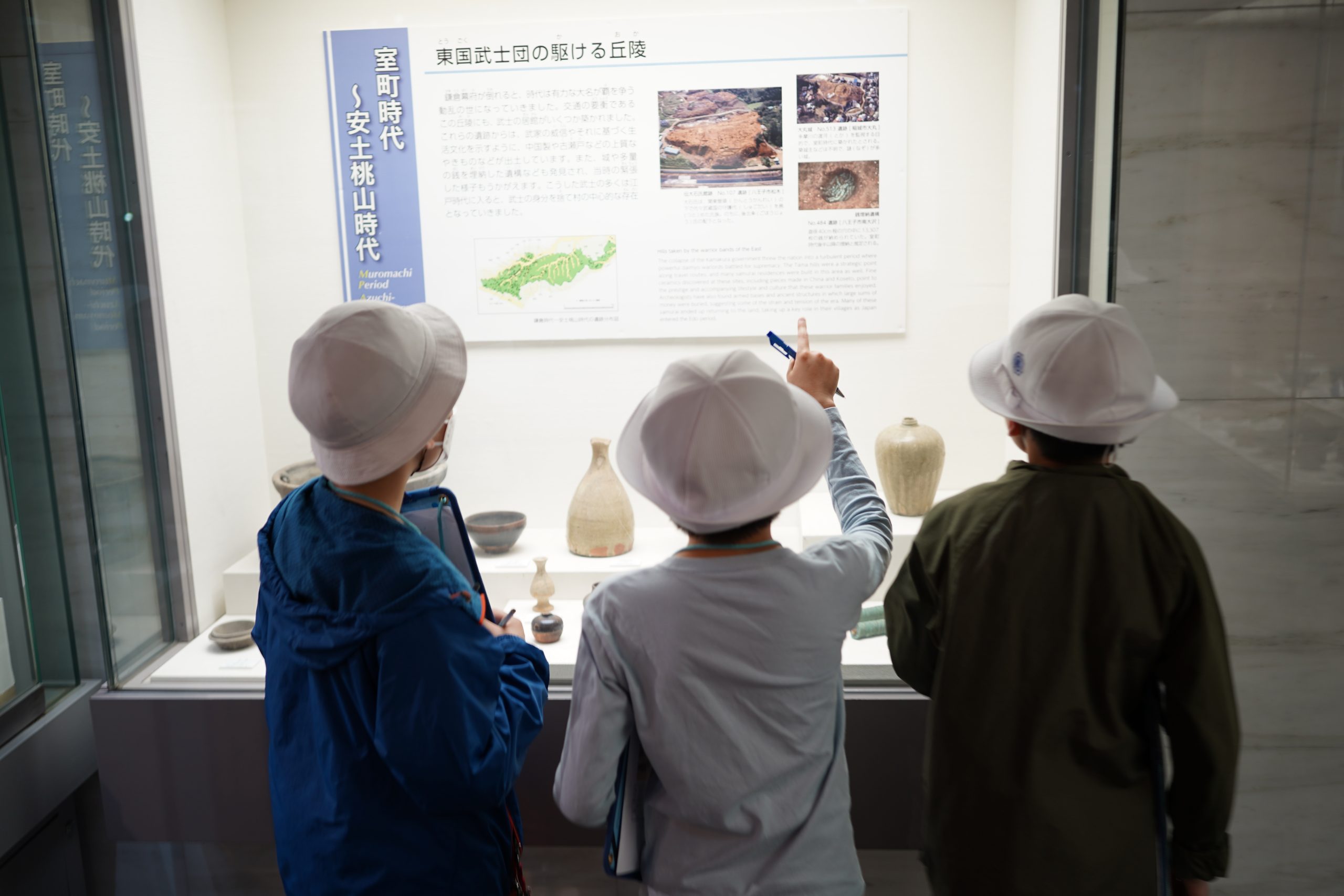 学校の近くの町田市をはじめ、稲城市・多摩市・八王子市にまたがる3000haもの広大な丘陵内には、約1000箇所もの遺跡が点在しているそうです。東京都埋蔵文化財センターの展示ホールには、そこで発掘された縄文土器などを展示しています。