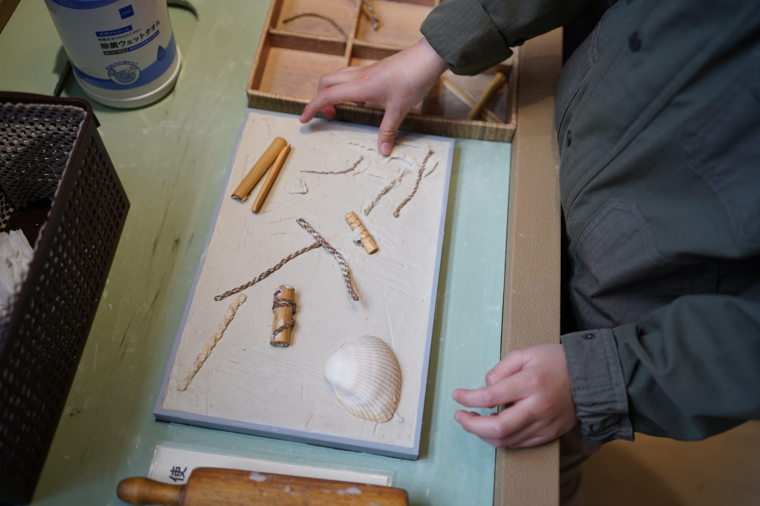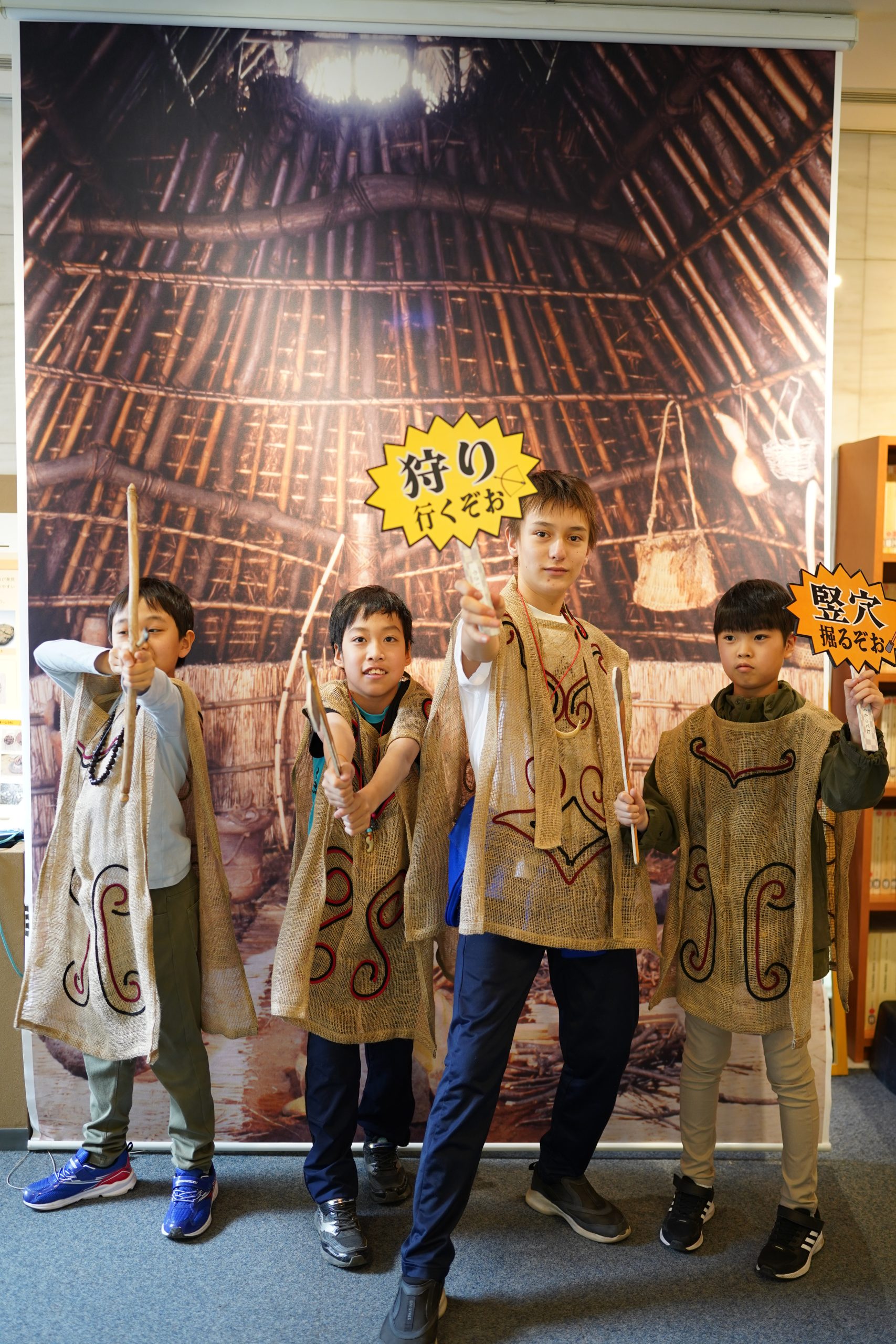 体験コーナーでは、火おこしの道具を使ったり、出土した土器を復元する様子のパズルを楽しんだり、土器の模様付け体験をしたりと時間たっぷり楽しみました。特に、縄文時代の服装と見られるものを実際に着てみることができるコーナーでは、「先生ー!写真撮ってー!」と縄文ファッションショーが行われていました。