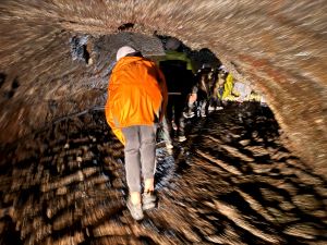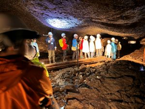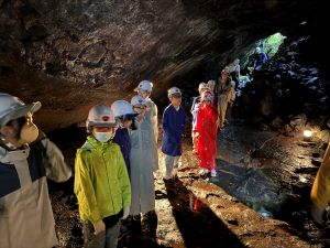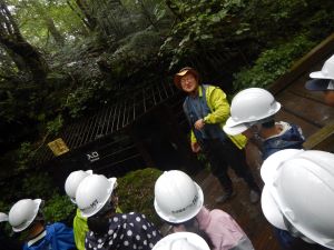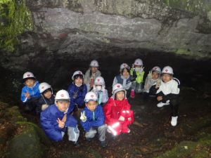 樹海に入ってしばらく進むと、大きな口を開けたコウモリ穴が出現しました。昨日、河口湖フィールドセンターで見学した溶岩樹型との大きさの違いに子どもたちは驚いていました。この中には縄状溶岩など、富士山がかつての火山活動でつくった珍しい地形をたくさん観察することができました。