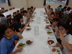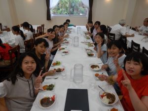 コウモリ穴の見学を終え、一度ホテルに戻り、昼食をいただきました。メニューはカレーライスです。たくさん食べて、午後の見学に備えます。