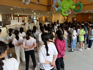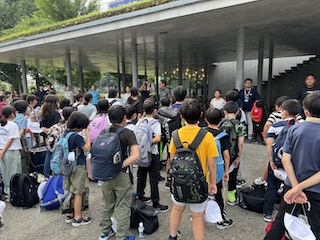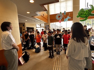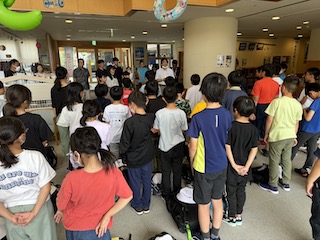 今日はホテルのロビーに集まって朝の会を行います。今日も校長先生からお話がありました。挨拶の重要性について話を聞きました。この臨海学校だけでなく、これからの生活にも活かしてほしいと思います。