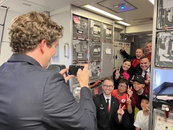 写真撮影用に持ってきたスマートフォンを使って何やら客室乗務員の方と話しているなと思ったら…。