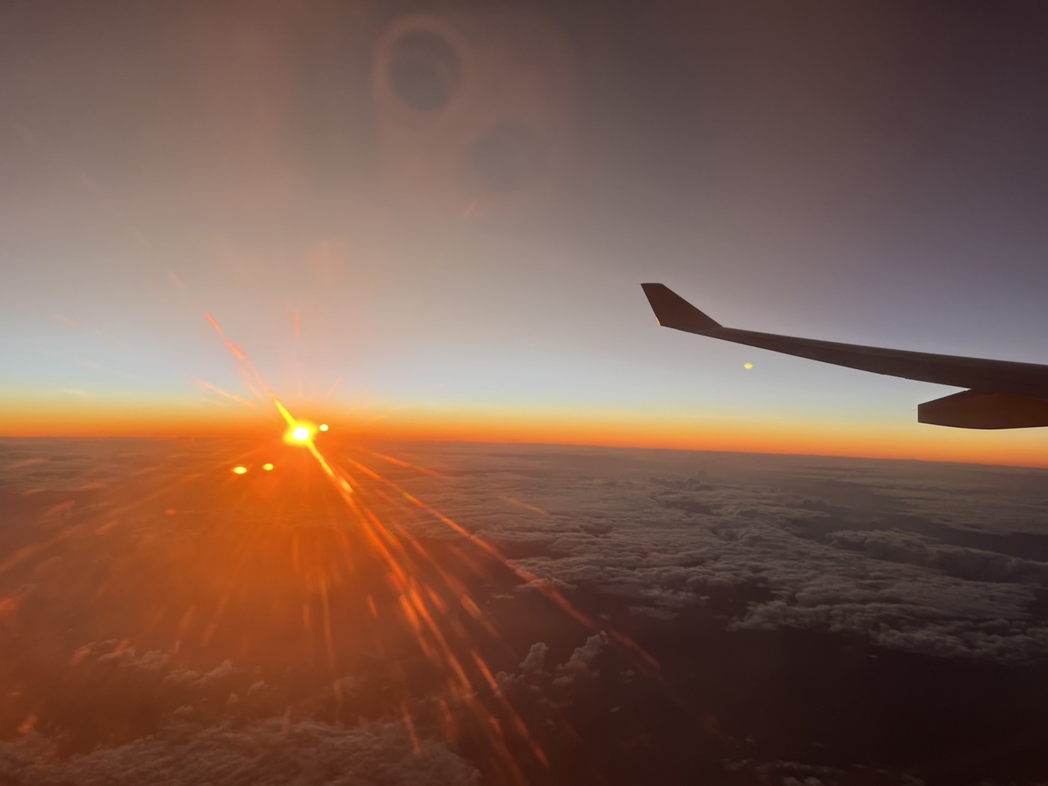 飛行機の窓からは、綺麗な朝焼けを見ることができました。