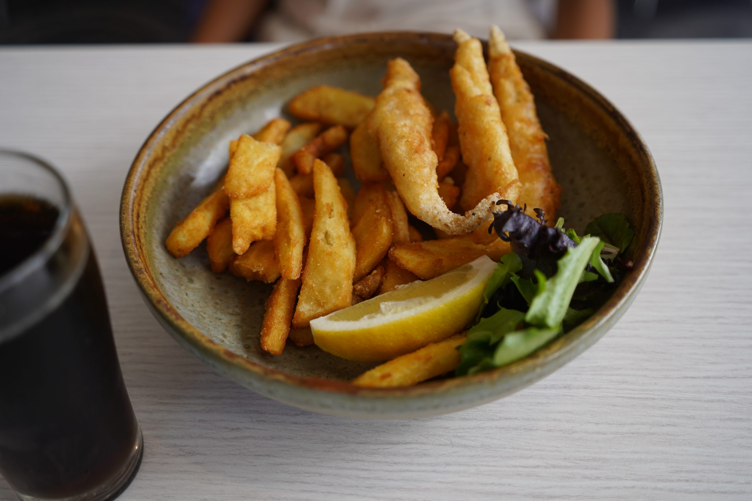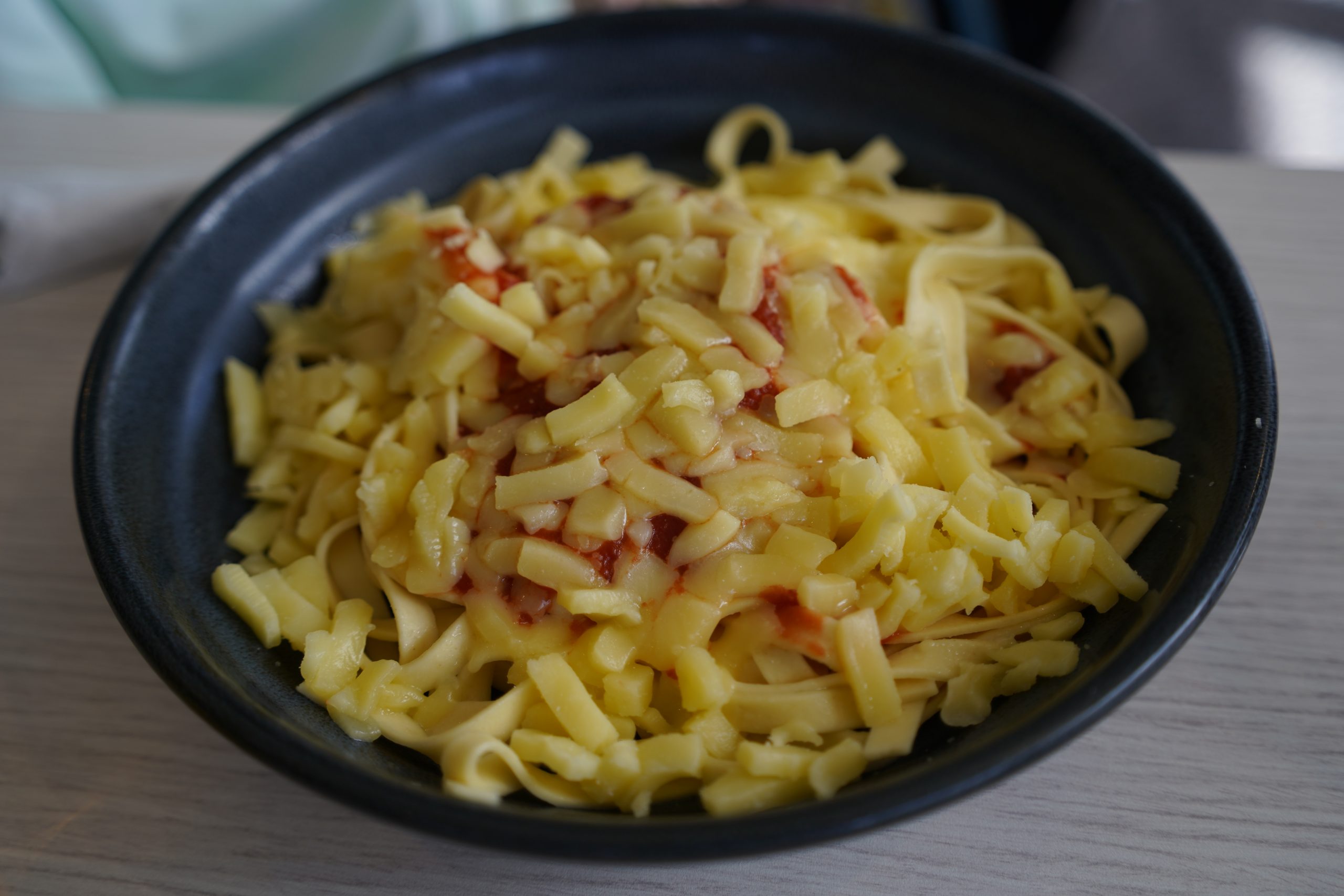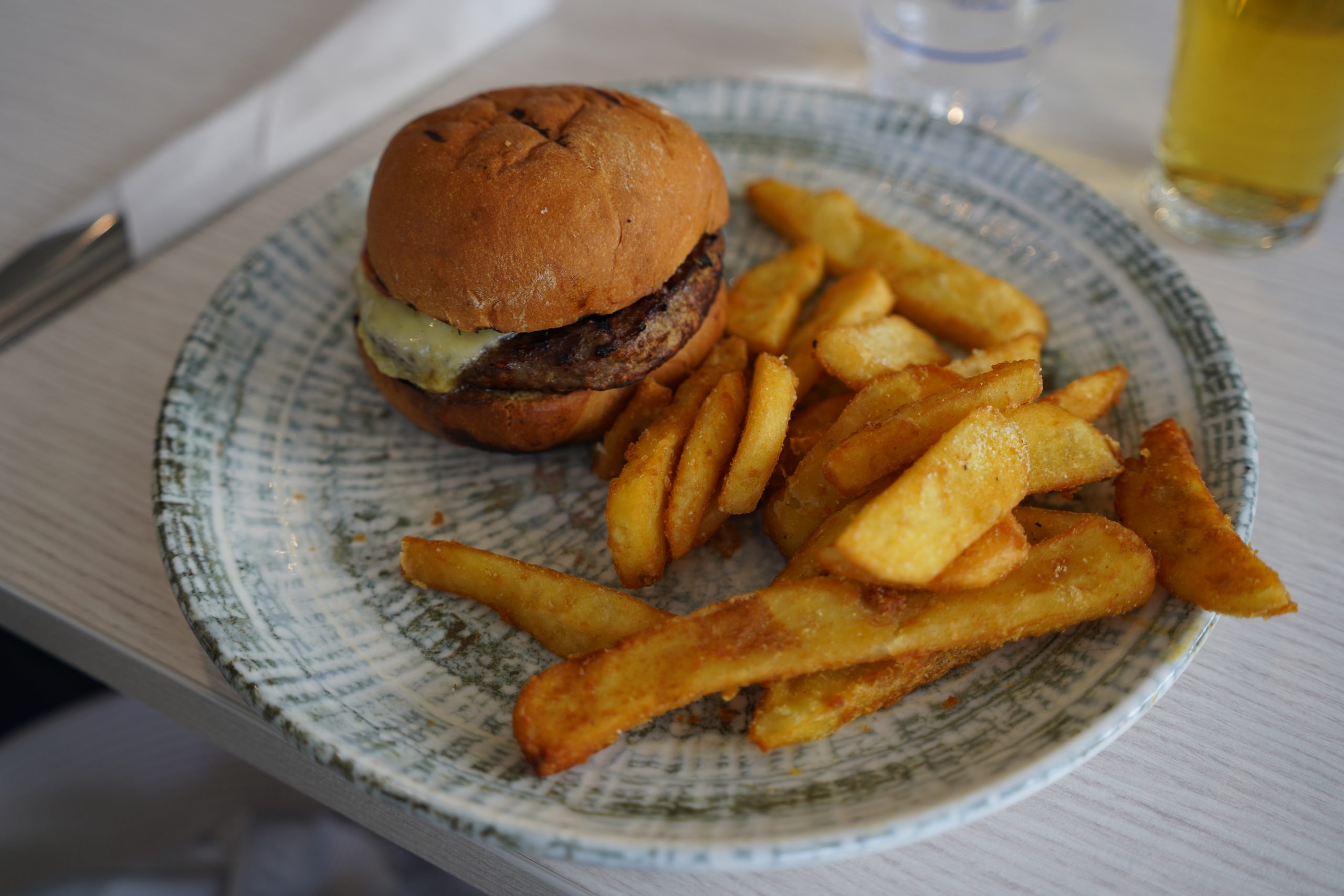 チーズバーガー、フィッシュ&チップス、パスタから好きなものを選んで食べました。