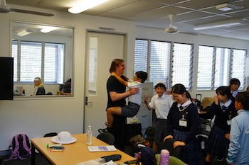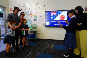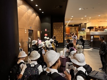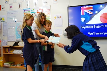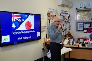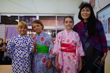 昨年度ホームステイに来たときに、「着なくなった浴衣や甚兵衛があれば寄付してもらえたら嬉しいです。」という話が、日本語の岡村先生からありました。今年度の参加者のご家庭にお声がけしたところ、何着か寄付をしていただきました。寄付していただいた皆様ありがとうございました。4年生の子どもたちに着てもらい、岡村先生と一緒に記念撮影をしました。