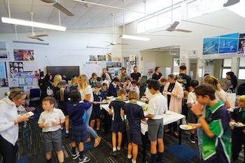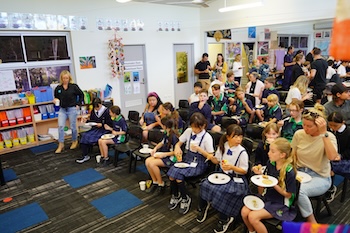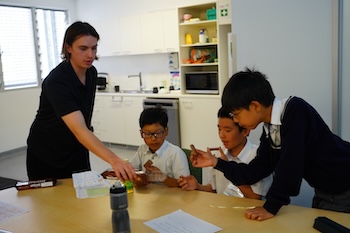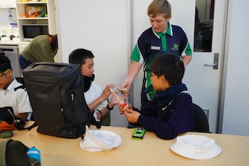 午前中にホストファミリーへのサンクスレターを完成させた後、英会話を教えてくださっているTaj先生から子どもたちにお菓子のプレゼント。みんな喜んで食べました。