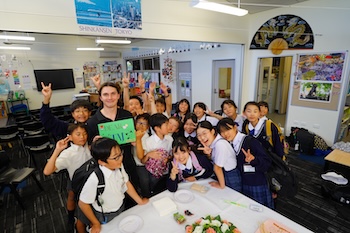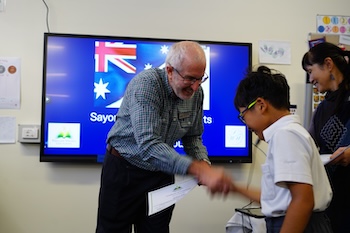 最後にお世話になったTaj先生にカードを渡しました。優しく英会話やハンドボールを教えてくれたり、子どもたちと一緒に遊んでくれたりしたTaj先生に感謝の気持ちを伝えました。