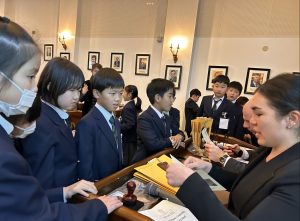 12:30にBlitish Hillsに到着しました。気温が低いですが、空気が澄んでいて、気持ちがいいです。昼食をとった後に、子どもたちは手作りのパスポートを持って、入国審査をしました。現地の職員の方に英語で名前や住所を聞かれ、子どもたちは緊張しながら入国を終えました。