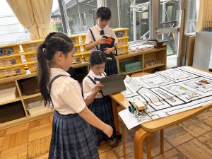 ロボットカーに手作りの迷路を走らせ、ゴールまで辿り着けるかどうかの挑戦をしました。カラーセンサーを使ってロボットカーを「黒い線で止める」、「黒い線上を走る」の二つのプログラムを利用することが成功の鍵です。「黒い線上を走ったが曲がることができない」「曲がることができたが次の黒い線上を走ることができない」などいくつかの問題が発生しましたが、一つ一つ克服し、ゴールに到着することができました。5月のミッションを見事クリアしました。