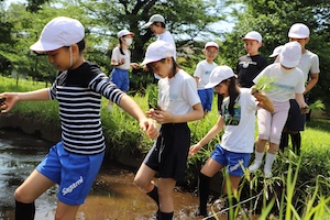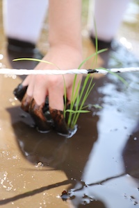 活動の中で、「田植えをする時にどんなことに気をつけたらいいですか?」と子どもたちに聞いた時に、「きれいに並べて植えたい。」という意見が多く出ました。「定規を使えばいいんじゃないかな。」というアイデアも出て、最終的に紐に等間隔で印をつけることに落ち着きました。子どもたちは、紐のガイドを目印に、丁寧に苗を植えていきました。