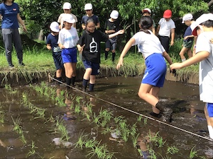 恐る恐る田んぼに足を入れていくと、前回代掻きをした時との感触の違いに驚く子どもたち。次々と悲鳴が聞こえてきます。吸い付いてくるような泥に足を取られながらも、自分の位置まで移動します。