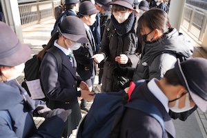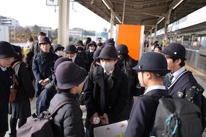 ホームで電車を待つ子どもたちは、少しそわそわしていて、これから始まる修学旅行への期待を感じました。