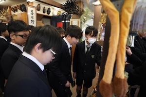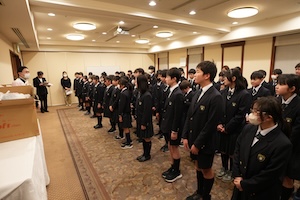 笑顔の話になると、少し会場の雰囲気が変わりました。「自分の笑顔を自分で見るには鏡などを介さないと見ることはできない。でも、他人の笑顔はすぐに見ることができて、その輪を広げていくこともできる。自分だけが楽しいことは自分の笑顔しか作ることはできず、しかも自分で見ることは難しい。でも、周りの人たちを楽しませることができれば、たくさんの笑顔を作ることができる。今回の修学旅行では、このことを心がけてください」と、お話がありました。