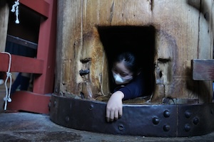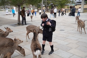 一人一枚ずつ鹿せんべいを配ったのですが、鹿にあげ足りない子はお小遣いで鹿せんべいを買ってあげました。鹿せんべいを買うと、一瞬にして鹿に囲まれます。山羊のバニラに餌をあげ慣れている子どもたちも、これには面食らったようでした。