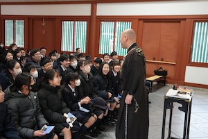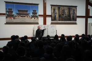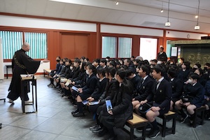 東大寺見学を終えた後は、バスで薬師寺に向かいました。最初は薬師寺のお坊さんからの法話をみんなで聞きました。薬師寺のこと、薬師如来のこと、三重塔のことなどをユーモアを交えて分かりやすく話してくださり、会場内は笑いが絶えませんでした。