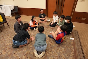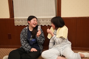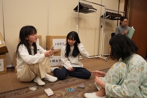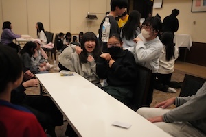 夕食後は自由時間がありました。オープンスペースと題して、ホテルの方から部屋をお借りして子どもたちに解放しました。部屋の行き来は禁止しているので、ここでみんなで楽しくカードゲームをして過ごしました。ここではたくさんの笑顔が見られ、子どもたちの楽しい思い出になったことと思います。