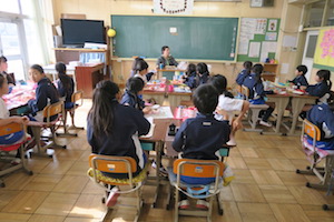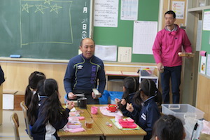 きょうの昼食は、学級担任以外の先生と一緒に食べる「先生シャッフル」です。1年生の教室では4年生の学級担任が子ども達と楽しそうに会話をしながら食事をしていました。