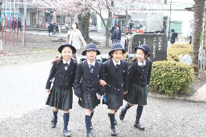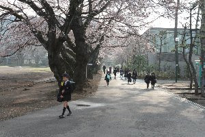 朝8時、子どもたちが登校してきました。通学路の桜並木は、まだつぼみが目立ちます。