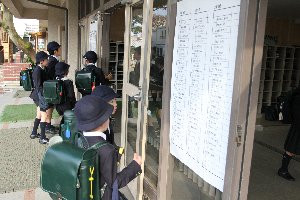 クラス替えのあった学年では、玄関に掲示された学級名簿で、自分のクラスを確認して教室に向かいます。心配そうに自分の名前を探したり「やったー!○○ちゃんと一緒のクラスだ!」と喜ぶ姿が見られました。