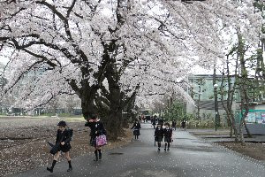 学園の桜並木も今日は満開。桜のトンネルをくぐって子どもたちが登校です。