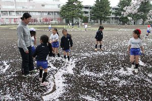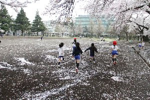 桜散らしの風が吹き、大グラウンドには桜の花びらの素敵な模様ができました。