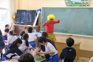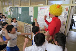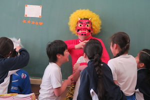 きょうは節分、昼食の時間、1年生の教室のドアをガラッと勢いよく開けて、入ってきたのは鬼!びっくりして声を上げる子どもたち。