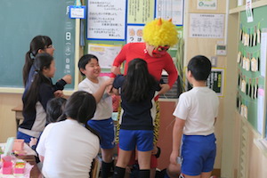 4年生の教室に鬼が突入すると、子どもたちの反応は低学年と打って変わって、ウェルカムムード一杯。