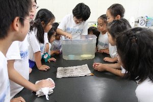 この班では、1年生の女子が投げ入れたコインが大きい皿にうまく入りました。