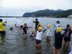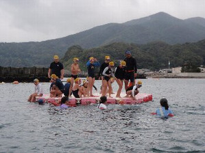 子どもたちは、無我夢中で泳ぎ続けました。そして、念願のフロートに全員上陸成功です。