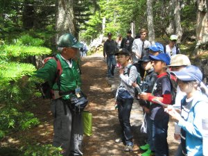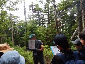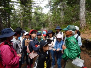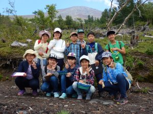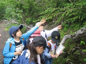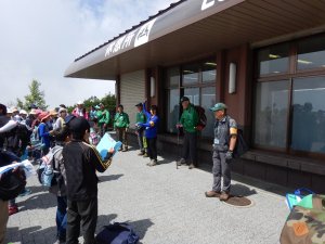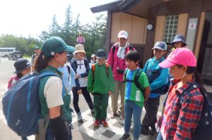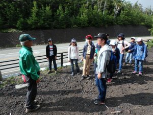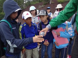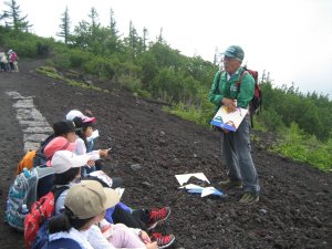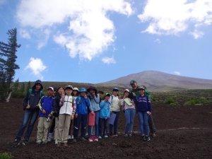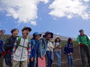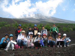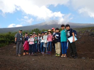 午後は、富士山5合目へ。お天気を心配していましたが、くっきりと富士山頂が見えていて、一安心。残念ながら、富士山から下は、雲の中でした。ここではボランティアガイドの方から、御中道の植生や富士山の成り立ちを中心にお話を伺いながらトレッキングをします。