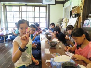 午前中は、富士五湖の一つ西湖近くの「西湖いやしの里根場」にでかけました。「西湖いやしの里根場」では、におい袋づくりやふくろうストラップなどの民芸品のクラフト体験に挑戦します。今回、クラフト体験を指導してくださる方々に挨拶をして作業場に移動しました。