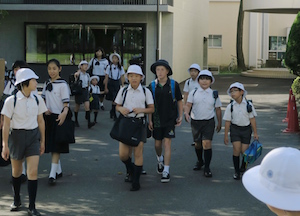 今回来日したのは男子2名女子2名の4名です。土曜日から、小学部保護者の家庭でホームステイに入り、今朝はそのホストファミリーのホームバディと一緒に登校です。朝、それぞれのバディと一緒に4人の子どもたちが次々登校してきました。電車やバスを使った登校、たくさんの児童や生徒など初めての環境や体験に緊張しているようです。