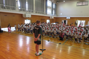今日は月曜日、全校朝会の日です。英語クラブの子どもたちが、英語と日本語で歓迎の挨拶をすると、オーストラリアの子どもたちも日本語で一人ずつあいさつをしました。校長先生も日本語で挨拶をして、小学部に素敵な写真を額装してプレゼントしてくれました。