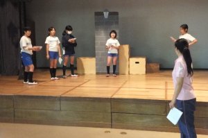 1年生の劇の練習シーンです。舞台の立ち位置などを先生と一緒に決めています。