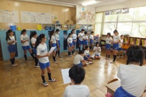 3年生は教室で、先生と一緒に劇の中で歌う曲の練習中でした。