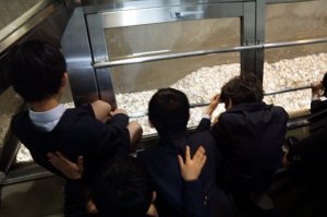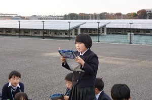 小学部大グラウンド4個分もの土地に、7668枚のソーラーパネルが並んでいます。灰を加工したスラブを埋めたゴミの最終処分場は、土地を20年間寝かせる必要があり、環境に配慮するために太陽光発電の場所としたそうです。あいにく夕方の曇りで、発電量を示すメーターの発電量は少なかったのですが、最後までしっかりと子どもたちは、説明を聞くことができました。