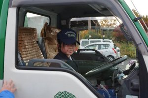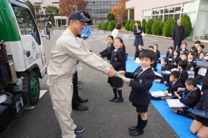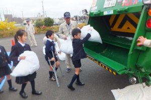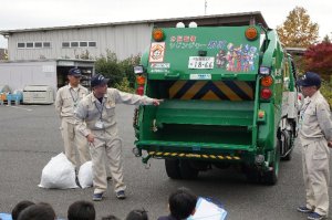 楽しかったのは、ゴミ集積車へのゴミ入れ体験でした。代表で集積車を操作した子もいました。