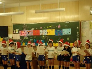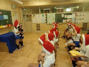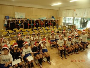 1組はクリスマスムード一色。全員がサンタ帽子をかぶって会に参加し、クリスマスソングで盛り上がりました。