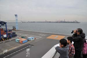大黒ふ頭にある横浜市港湾局コンテナターミナルで横浜港のお話を聞き、大きなコンテナが船に積み込まれる様子を見学しました。