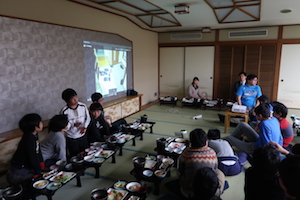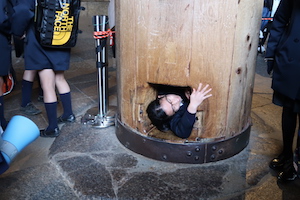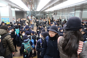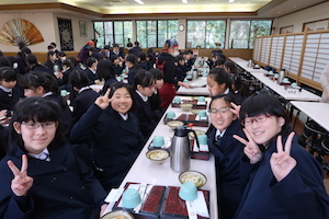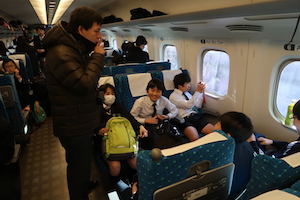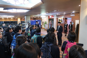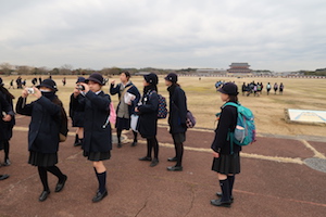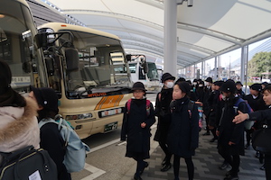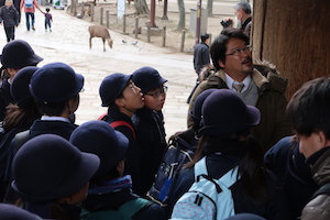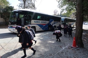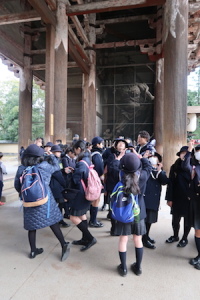 IMG_5103朝8時、新横浜駅に見送りの保護者の方と一緒に子どもたちが次々と集まってきました。大きな荷物は事前に宿に送ってあり、皆手軽なリュック一つです。開校式では校長先生から「楽しい3日間になるよう、マナーを守り、部屋の友だちと仲良く過ごして下さい」と話がありました。2名の添乗員も紹介され、いよいよ新幹線のホームに向かいます。IMG_5104見送りに来て下さった家族の方とはここでお別れです。「行ってきます!」IMG_5107ホームに出て通過する新幹線を見ながら、気分はだんだんと修学旅行に。乗り込む新幹線がホームに入ってきました。IMG_5109新幹線に乗り込むと、早速座席を回転。グループでカードゲームを楽しんでいました。IMG_5116あっという間に京都駅に到着。予想していたほど寒さは厳しくありません。IMG_5118駅前で待機していた奈良観光のバス2台に分乗し、ここから最初の見学地「奈良」に向かいます。IMG_5119京都駅から奈良までは高速道路で約1時間程度。バスガイドさんから、道中バスから見ることの出来る建物や山々、地名など、観光案内をして頂きました。IMG_5120到着したのは、奈良公園春日大社。駐車場にバスを止め、近くにある食堂に向かいました。まず腹ごしらえです。IMG_5123昼食のメニューはミニうどんとお弁当です。食事係の司会で食事が始まりました。うどんの味付けは「関西風」、あっさり味です。IMG_5126食事を終えた頃、食堂に奈良公園を案内してくれるガイドさんが現れました。ガイドさんたちは全部で5人、5つのグループに分かれて見学です。IMG_5130奈良公園の中を東大寺目指して移動しました。公園内には鹿がたくさんいます。小学部の山羊と違って、鹿は公園内を自由に歩き回って食べ物をねだります。IMG_5133IMG_5144ガイドさんたちは、ボランティアではなくプロのガイドです。皆、とても説明が上手で子どもたちも良く聞いていました。IMG_5138目の前に東大寺が現れると、建物の大きさは迫力満点。左右に大きく広がった重厚な瓦屋根や、太く立派な木で作られた柱や梁は見る人に畏敬の念を抱かせます。IMG_5146現在の東大寺は、江戸時代に再建されたもので、最初に建てられた東大寺は現在の建物の約1,5倍もあったそうです。重機類の無い時代、どのようにしてこれだけの建物を建てたのでしょうか?IMG_5152ガイドさんに引き連れられいよいよ東大寺の建物の中へ入りました。IMG_5153薄暗い境内の中央には有名な「奈良の大仏」が鎮座しています。近くで見上げるとその大きさに圧倒されました。IMG_5165境内の柱に大仏様の鼻の穴と同じ大きさと言われるの穴が開いているものがあります。穴は人が一人やっとくぐれるくらいの大きさです。穴をくぐると頭が良くなると言われ、子どもたちも何人か挑戦しました。IMG_5178大仏様を見学した後、南大門を見学しました。有名な運慶・快慶が作ったという仁王様が8メートルの高さからこわい顔でにらみつけていました。IMG_5172南大門の大きな柱には、当時の火縄銃の弾痕が残されていて、ガイドさんが実際の弾がいまだに残っている穴を教えてくれました。IMG_5180いよいよ奈良公園、鹿とのふれあいタイムです。添乗員さんたちが、子どもたちに鹿せんべいを分けてくれました。IMG_5195せんべいを手にしたとたん、鹿にモテモテ。嬉しいような怖いような。IMG_5199奈良公園の見学を終え、バスに乗り込み平城宮跡に移動しました。IMG_5201IMG_5202IMG_5205平城宮跡は、その敷地の広さにみんなびっくり。朱雀門の前で、クラスごとに記念撮影をしました。IMG_5214朱雀門から大極殿まではさらに広い空間が広がっています。IMG_5220IMG_5221最後に見学した平城宮跡資料館には、発掘した木簡や木の机など、当時の様子が分かる展示物が飾られていました。IMG_5225館内の見学を終え、ガイドさんとはここでお別れです。若いガイドさんが多く、どのガイドさんも子どもたちの気持ちをつかんだ案内をしてくれました。お世話になりました。IMG_5227バスに再び乗り込んで京都に戻りました。道中1時間、歩き疲れたのか、眠り込んでしまう子どももいました。IMG_5233バスが宿の近くに駐車する頃は、すっかり夕方になっていました。IMG_5239今日宿泊するホテル洛兆に到着。立派なホテルです。IMG_5242ロビーで支配人さんに挨拶をしました。IMG_5244IMG_5245着替えを済ませて、お待ちかねの夕食タイム。IMG_5250食事の後、部屋に荷物が散乱している班の様子を、先生が画像で紹介。食事のマナーや整頓の仕方について改めて確認しました。IMG_5253夕食後、明日子どもたちがグループに分かれて見学する京都の神社仏閣について、事前勉強しておこうと京都の魅力や見所について、雑誌やラジオ、大学でも講義をしているという「らくたび」の代表取締役の方を講師に招いてお話を伺いました。分かりやすく、クイズや実技も交えたお話は、神社とお寺の違いや、お参りするときの作法の具体的な方法などにも及び、子どもたちも全員聞き入っていました。明日の見学が楽しみ