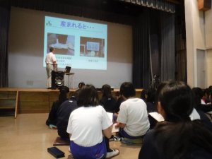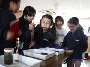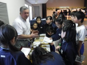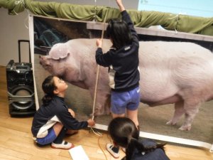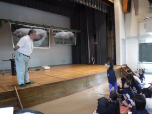 会場になった小学部の視聴覚ホールには、実寸大のブタ(オスとメス)の写真模型や飼料、糞のサンプルなどが所狭しと並べられ、入ったときから子どもたちは興味津々でした。