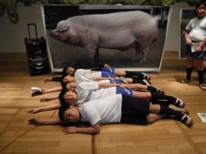 まずは映像で、食用のブタが生まれてから枝肉となるまでのたった六ヶ月の一生を見せていただきました。生まれた直後から獣医師によるたくさんの検査を通って、それに合格した個体だけが肉になることや、「食べないのは鳴き声だけ」というほどブタの体は、骨・皮・血液・などすみずみまで人間が利用していることなども学ぶことができました。