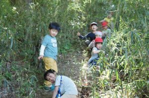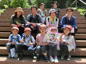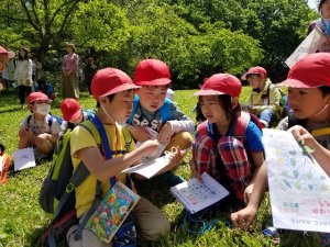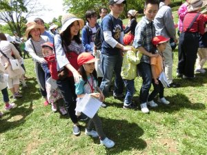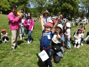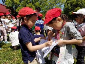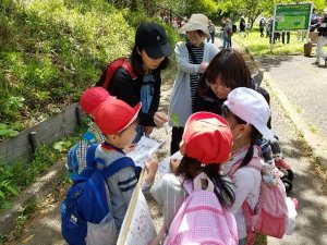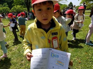 続いて、春の草花探しを班ごとに楽しみました。しおりには、ハート型、剣型、羽型、手のひら型などの葉っぱの形を探そうという課題が書かれていて、それをみんなで探します。しっかり見つけると保護者に皆様からシールがもらえるというルールです。