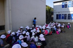 先生から遠足に向けての心構えを聞く子どもたち、どの子も目をきらきらさせて聞いていました。