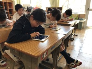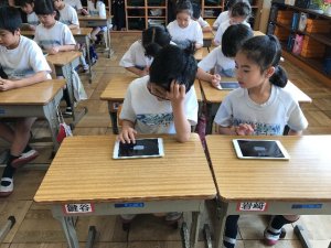 考えを発表する場面でも、ipadの画面をテレビモニターに子どもが映しながら説明します。
