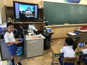 「ぼくは、この地図記号は城だと考えました。なぜなら、地図記号のこの部分が、城の石垣に似ていたからです。」と、理由を述べながら発表していました。また、画面に、自分がどこに注目したか印をつけながら発表し、発表者の意図が子どもたちによく伝わっていきました。