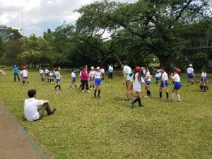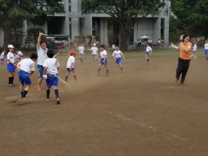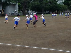 手つなぎ鬼、蛇じゃんけんフリースビードッジ、靴取り、しっぽ取り、大縄跳び。先生も一緒に楽しみました。
