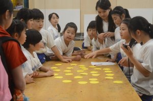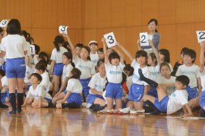 最初は、縦割りチームごとにクイズに挑戦しました。先生の数や教室の数など数字に関する問題が出ました。