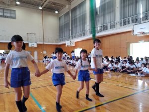 今日から、1年生が縦割りチームに加わります。6年生が企画して「1年生を迎える会」が開かれました。
